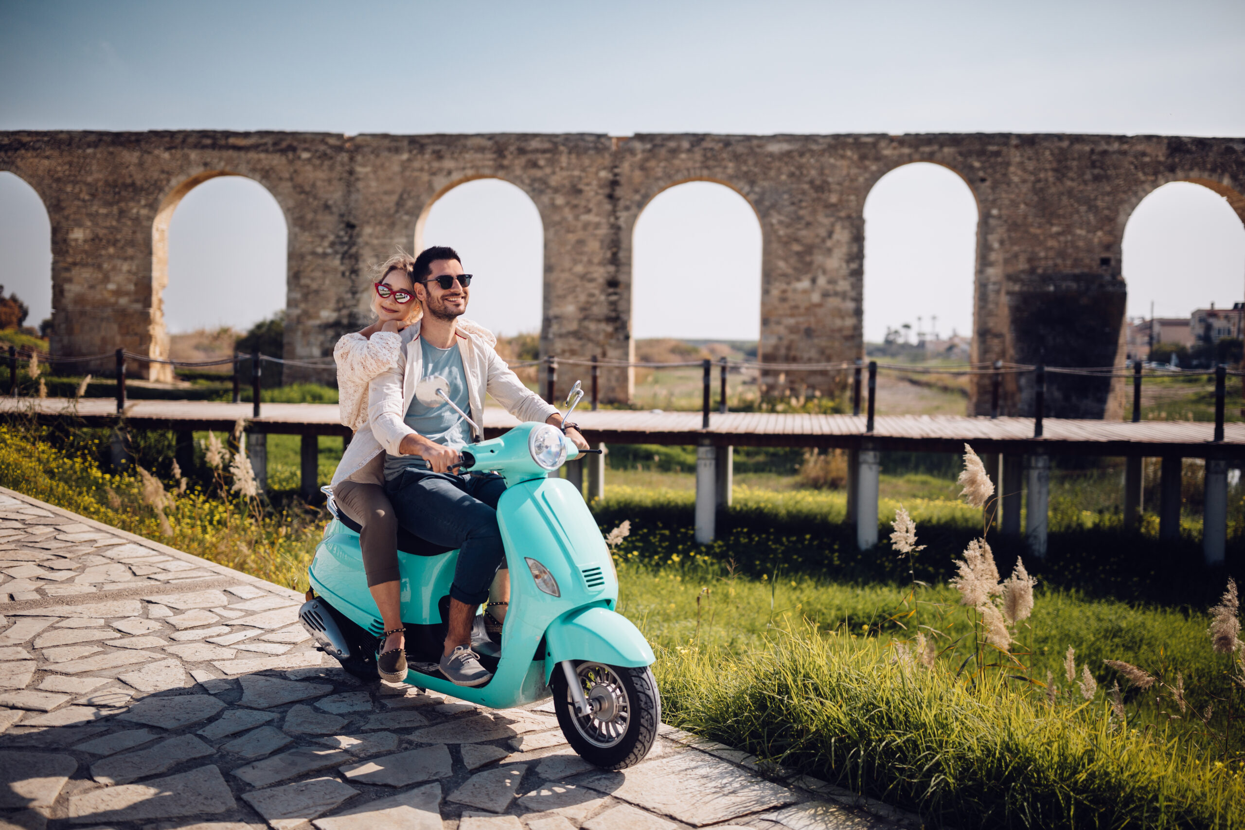 Young loving couple with vintage motorcycle riding next to ancient stone aqueduct monument in Spain