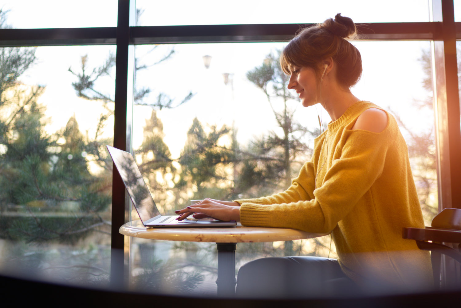 Young student using laptop sitting at cafe table. blonde female student using portable laptop computer while work at the coursework. Girl watching movie online on portable pc and electronic earphones