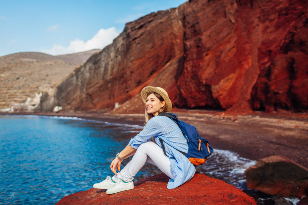 young traveler woman relaxing sitting on red beach rock on