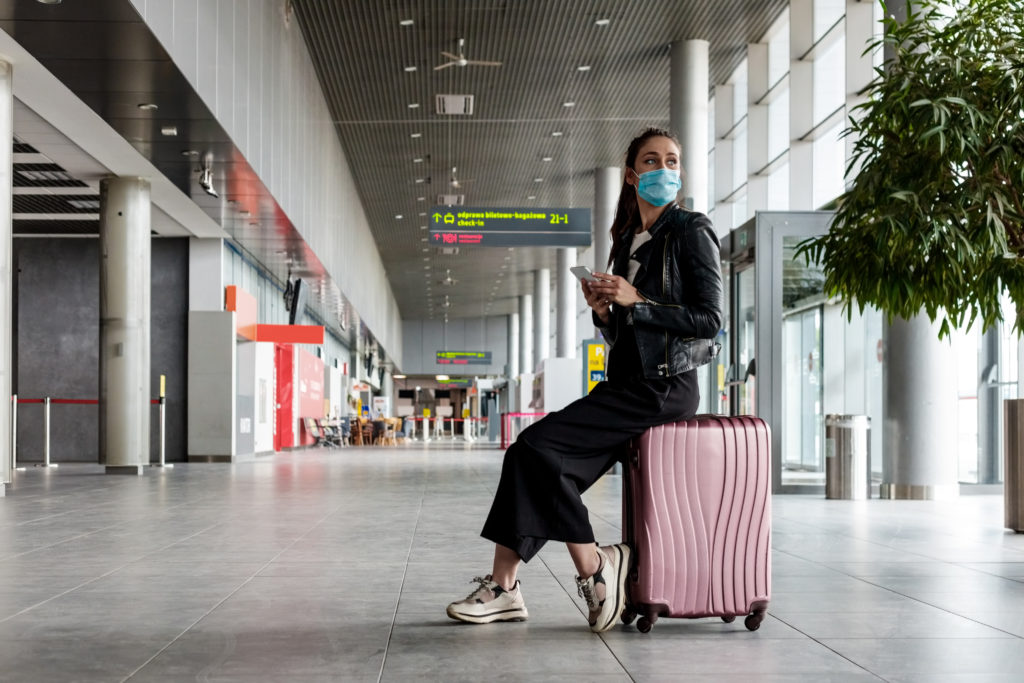 Young woman at the airport with luggage, wearing N95 face masks