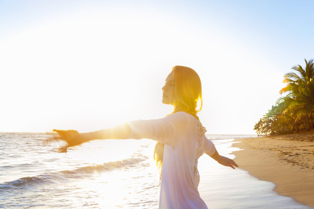 Young woman dancing on beach at sunset, Dominican Republic, The Caribbean