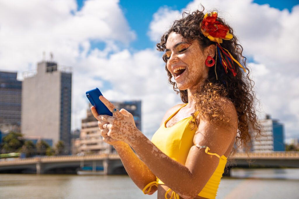 Young woman sending message online by smartphone ID: 76632 Brazilian Carnival, Brazilian Culture, People, Tradition, Rio Capibaribe