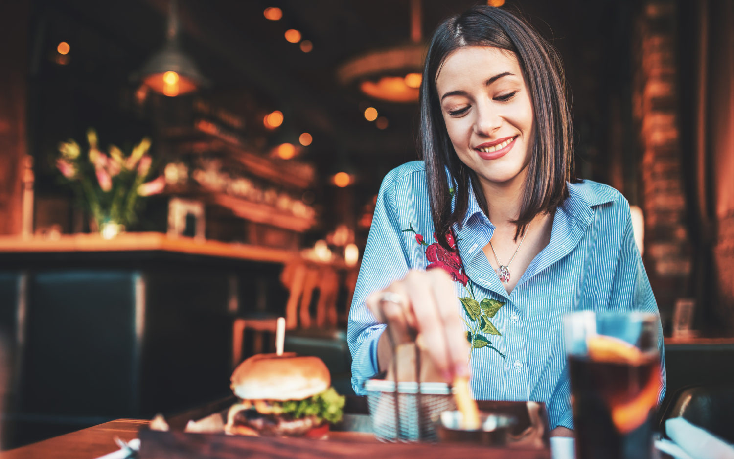 young woman sitting in a cafe and enjoying in breakfast