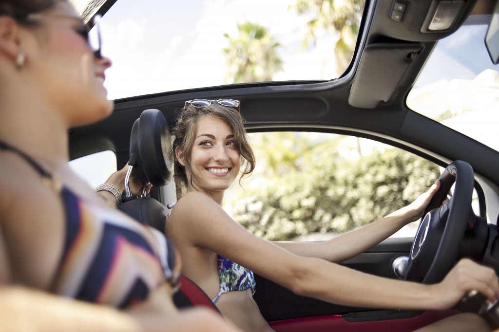 Young woman sitting in car in tropical location