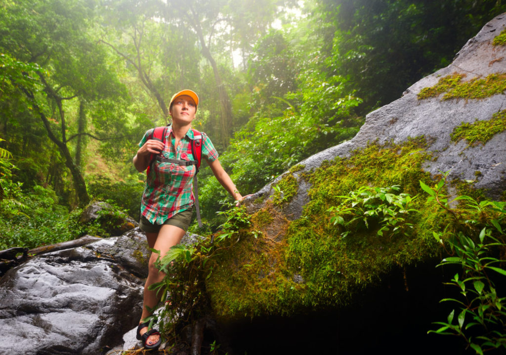 Young woman tourist with a backpack walking along the trail in the rain forest. Lombok, Indonesia.