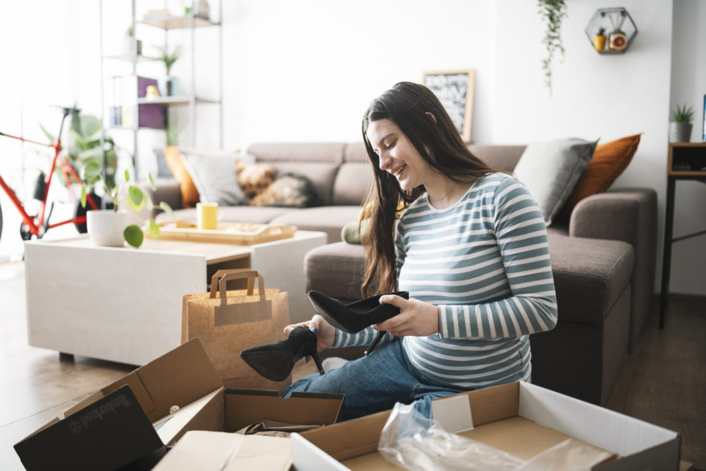 Young woman unboxing online purchases in living room. ID: 70607 Young woman ecited to unbox online purchases in living room.