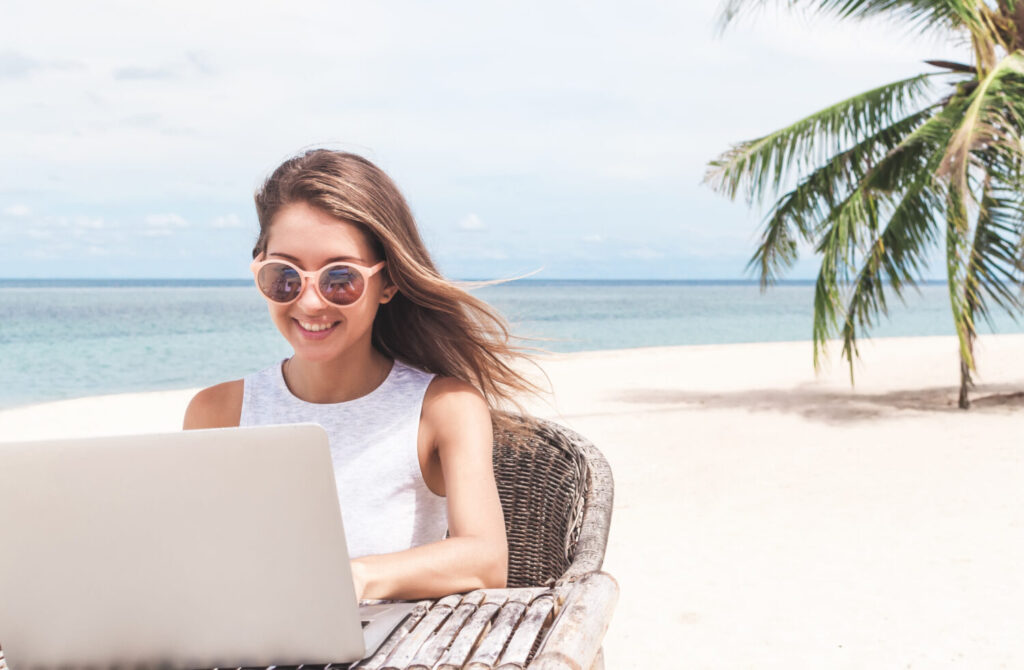 young woman using laptop computer on a beach freelance ID: 83100 Young woman using laptop computer on a beach. Freelance concept