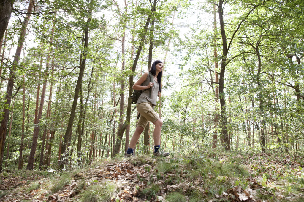 Young woman with backpack on a hiking trip in forest