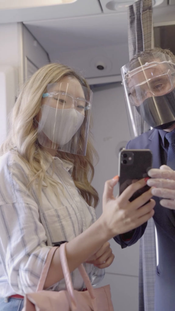 Video: Pasajera con mascarilla y escudo facial siendo recibida por la tripulación Download Video (Español) Origin Photoshoot Restrictions for use Free Use, full media, worldwide.