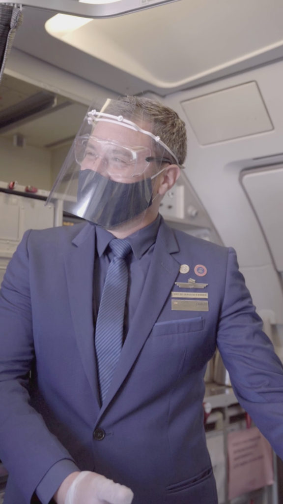 Video: Tripulante con mascarilla y escudo facial dando la bienvenida en la entrada del avión